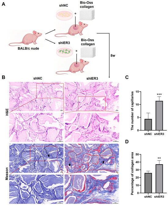 Histological evaluation of IER3 knockdown hMSCs after subcutaneous implantation in nude mice. (A) Schematic diagram of hMSCs from the shIER3 and shNC groups, mixed with Bio-Oss collagen and implanted subcutaneously in the backs of nude mice to establish the model (n = 4). (B) Representative H&E and Masson’s trichrome staining of the implant regions after eight weeks. The black dashed lines indicate representative areas of the residual collagen components of the Bio-Oss collagen, and the black arrows indicate the newly formed collagen. Scale bar, 50 μm. (C) The number of capillaries according to the H&E staining images. (D) Histomorphometry analysis according to the Masson’s staining images. *** p < 0.001, ** p < 0.01.