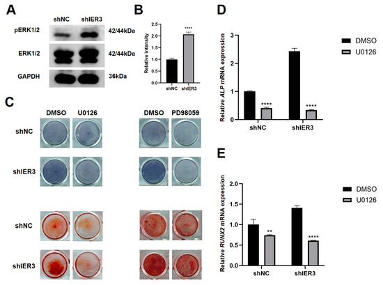 To explore the downstream signaling pathways regulated by IER3, 10 μM U0126 and 20 μM PD98059 (specific MEK1/2 inhibitors, upstream activators of ERK1/2) were added to the osteogenic induction medium. Equal volumes of Dimethyl sulfoxide (DMSO) were used as a control.