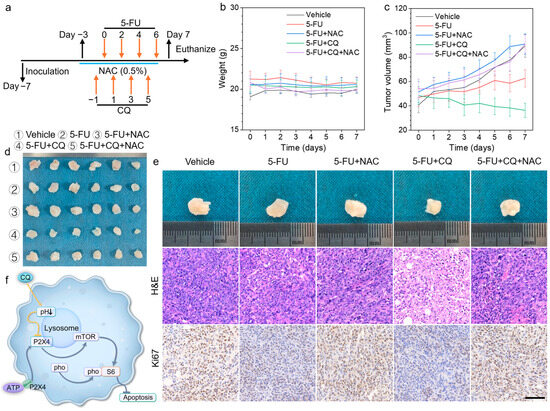 Consistently with previous studies [21,29], we confirm that CQ can enhance the antitumor effects of 5-FU. The EDU proliferation assay revealed that the chemosensitizing effect of CQ on 5-FU exhibited marked ROS dependency, as evidenced by N-acetylcysteine (NAC) abolishing this enhancement through free radical scavenging [22]. This confirms CQ’s role in amplifying 5-FU-induced oxidative stress. Further investigation uncovered that extracellular ATP-mediated mTOR activation—a well-established mechanism of chemoresistance—in 4T1 cells was suppressed by CQ through the disruption of lysosomal P2X4 receptor functionality (Figure 5f). Notably, we observed that CQ induced the acidification of the tumor lysosome, which contrasts with previous studies [30,31]. Mechanistically, this pH shift appears attributable to hyperactivation of the V-ATPase complex [32,33], which diminishes P2X4 receptor activity within acidified lysosomes [34,35], thereby blocking ATP-triggered mTOR signaling transduction. Finally, the regulatory effect of CQ on the ATP-P2X4-mTOR signaling axis and its chemosensitizing potential were further validated using a tumor-bearing murine model.