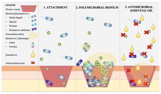 Schematic representation of the stages involved in chronic wound colonization and the effect of essential oils. (1) Attachment: Motile and non-motile bacterial cells (both Gram-positive and Gram-negative phenotypes) initially adhere to the wound surface; (2) polymicrobial biofilm: Bacterial proliferation and biofilm maturation occur with the development of an extracellular matrix, comprising mixed phenotypes including antibiotic-resistant, mucoid, and persister cells; (3) antimicrobial essential oil exposure: Essential oils penetrate the biofilm, exerting bactericidal activity on both planktonic and biofilm-embedded cells, resulting in visible zones of antimicrobial action.