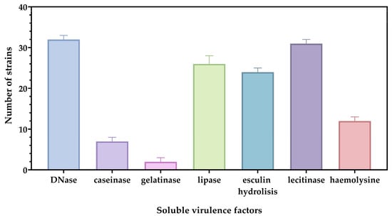 The enzymes associated with soluble virulence factors promote the tissue integrity destruction, creating favorable conditions for infection progression but also bacterial survival in the external environment, thereby increasing the risk of transmission to new susceptible hosts. In our study, 70% of pathogenic strains were found to produce DNase and lecithinase (Figure 2). Lecithin (phosphatidylcholine) is a key component of cell membranes. The enzymatic activity of lecithinases leads to membrane disruption, cell lysis, and tissue damage, contributing to bacterial virulence [].