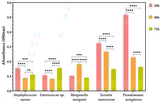 In general, most bacterial species exhibited a high adhesion capacity to the inert substrate within the first 24 h, followed by a decline in absorbance values (Figure 3). This decrease indicates a reduced ability to form mature biofilms. However, some exceptions were observed, such as M. morganii at 24 h and Enterococcus spp. at 72 h, which exhibited the highest levels of adhesion and were also capable of forming biofilms (Figure 3). The adhesion to the inert substrate primarily relies on adhesins, which facilitates the development of biofilms.