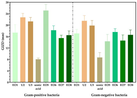 Graphical representation of the arithmetic mean values of the growth diameters of the inhibition zones (GIZDs) for the tested species. The results are expressed in millimeters (mm). The differences between samples are statistically analysed using one-way ANOVA and Tukey’s multiple comparisons tests. The data are considered statistically significant (p < 0.001).
