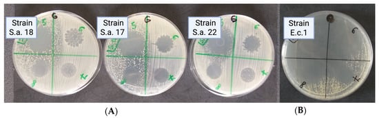In comparison to the growth control of Gram-positive pathogenic species, it can be observed that the cell suspensions of LAB exerted inhibitory effects on the growth of the tested Staphylococcus species in the favorable environment provided by MRS medium (Figure 8). Notably, a pronounced inhibitory effect was evident in SC5 (L. rhamnosus), which was isolated from newborn feces (Figure 8).