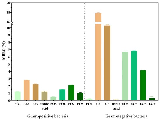 Graphical representation of the minimum biofilm eradication concentration—MBEC (%)—of the tested strains. The differences between samples are statistically analyzed using one-way ANOVA and Tukey’s multiple comparisons tests. The data are considered statistically significant (p < 0.001).
