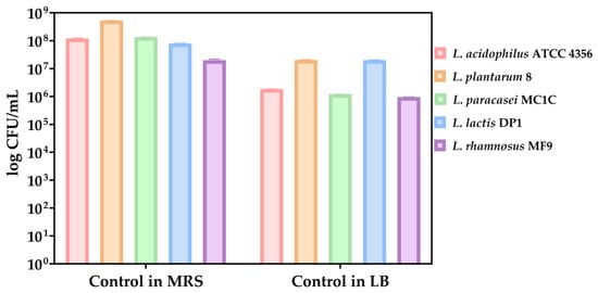 Bacterial growth (CFU/mL, logarithmic scale) of probiotic strains after 24 h incubation in MRS and LB media. Initial suspensions were standardized to 0.5 McFarland (approx. 1.5 × 108 CFU/mL); increases reflect post-incubation growth in nutrient-rich conditions. Values represent means ± standard deviation from three biological replicates. Axis uses logarithmic scaling for clarity. The data results are considered statistically significant (p < 0.0001).
