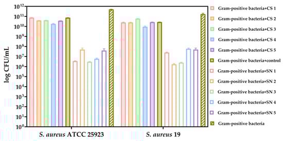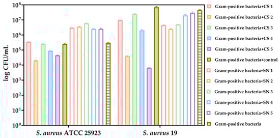 Bacterial growth (CFU/mL, logarithmic scale) of the selected Gram-positive bacteria (S. aureus ATCC 25923 and S. aureus 19) after 24 h co-cultivation in MRS medium with LAB fractions. Co-cultures included either LAB cell suspensions (CS1–CS5) or supernatants (SN1–SN4). Controls included S. aureus monoculture and unexposed LAB. The data results are considered statistically significant (p < 0.0001).