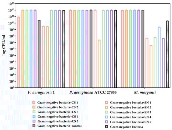 Graphical representation of CFU/mL (logarithmic scale) resulting from co-cultivations in LB medium of lactic acid bacteria supernatants and cell suspensions with tested Gram-negative bacteria. The data results are considered statistically significant (p < 0.0001).
