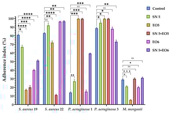 Graphical representation of the cell substrate adhesion index of the tested strains. The differences between samples are statistically analyzed using two-way ANOVA and Dunnett’s multiple comparisons tests. The data results are considered statistically significant (ns—not significant; * p < 0.049, ** p ≤ 0.067, *** p ≤ 0.005, **** p < 0.0001).
