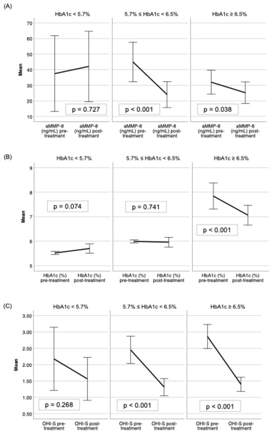 Pre- and post-SRP treatment effect on mean levels with 95% confidence intervals shown of (A) aMMP-8 (ng/mL), (B) HbA1c (%), and (C) OHI-S among normoglycemic (HbA1c < 5.7%), prediabetes (5.7% ≤ HbA1c < 6.5%) and diabetes (HbA1c ≥ 6.5%) groups.