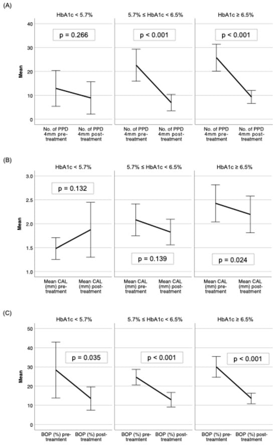Pre- and post-SRP treatment effect on mean levels with 95% confidence intervals shown of (A) PPD ≥ 4 mm, (B) mean CAL, and (C) BOP (%) among normoglycemic (HbA1c < 5.7%), prediabetic (5.7% ≤ HbA1c < 6.5%), and diabetic (HbA1c ≥ 6.5%) groups.
