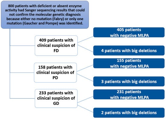 Vinci M, Zizzo C, Moschetti M, Giacomarra M, Anania M, Duro G, Di Chiara T, Russo M, Messina E, Colomba P, et al. Multiplex Ligation Probe Amplification and Sanger Sequencing: Light and Shade in the Diagnosis of Lysosomal Storage Disorders. Biomedicines. 2025; 13(4):973. https://doi.org/10.3390/biomedicines13040973