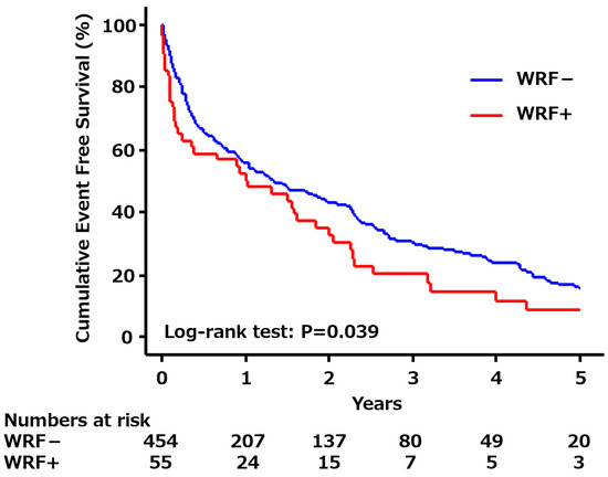 In patients with WRF, the cumulative event-free survival is significantly worse than in those without WRF (log-rank test: p = 0.039). WRF, worsening renal function.