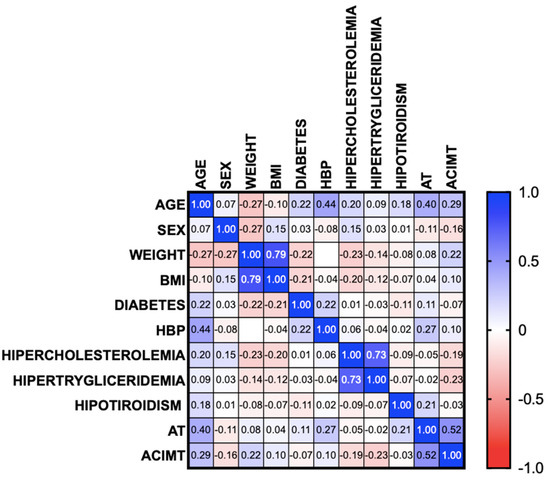 Atherosclerosis was found in 11 patients with MASLD (16.2%), and only 1 patient had 1 unilateral partial stricture (1.4%). Right CIMT was altered in 13 patients (19.1%); left CIMT was altered in 19 patients (27.9%); and there was bilateral alteration in 7 patients (10.3%). The flow velocities of the common carotid artery, the internal carotid, and the external carotid (both the right and left) were significantly different in the patients with atherosclerosis compared with those in the patients with no CIMT alterations, showing a marked decrease in arterial flow velocity. The correlation analysis showed that greater age (95% CI r = 0.1697 to 0.5818, p = 0.001) and the presence of high blood pressure (95% CI r = 0.030 to 0.4808, p = 0.028) were correlated with the presence of atherosclerosis. However, regarding early changes demonstrated by CIMT alterations, the only correlation was with age (95% CI r = 0.1532 to 0.5705, p = 0.002), with no differences in the rest of the comorbidities (Figure 1).