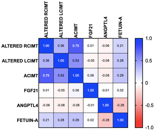 A sub-analysis was carried out to determine the differences in the hepatokine levels of patients with altered CIMT, and no significant differences were found. Fetuin-A was positively correlated with the presence of altered CIMT (95% CI r = 0.05486 to 0.4967, p = 0.016) for alterations in both the right branch (95% CI r = −0.02967 to 0.4335, p = 0.085) and the left branch (95% CI r = 0.03651 to 0.4857, p = 0.025). No correlation was found in ANGPTL4 or FGF21 (95% CI r = −0.3144 to 0.1631, p = 0.518 and 95% CI r = −0.1875 to 0.2916, p = 0.657, respectively) (Figure 3).