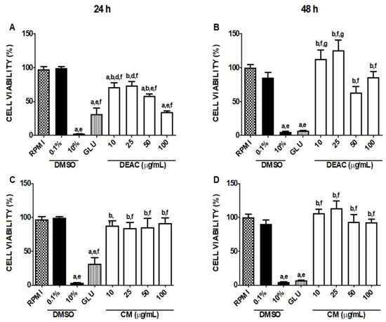 For the experiments, 200 µL/well of this suspension were placed in sterile 96-well plates and incubated for 16 h (37 °C and 5% CO2). Subsequently, 20 µL of medium were removed from the wells, except for viability controls, and 20 µL of DEAC and CM were added, for final concentrations of 10, 25, 50, and 100 µg/mL. Then, the plate was incubated (37 °C; 5% CO2) for 24 and 48 h. After this period, plates were washed with 200 µL/well of sterile phosphate buffer saline (PBS; Sigma-Aldrich), pH 7.4, at 37 °C; 200 µL/well of supplemented RPMI was added, and the plate was incubated for 90 min (37 °C; 5% CO2). Then, 100 µL/well were removed, and 100 µL/well of MTT (3-(4,5-dimethylthiazol-2-yl)-2,5-diphenyltetrazolium bromide), at a concentration of 1 mg/mL in sterile PBS, was added, and the plate was incubated for 4 h (37 °C; 5% CO2). Finally, MTT was removed, and 150 µL/well of pure DMSO were added, and the plate was wrapped in aluminum foil, shaken for 10 min, and allowed to rest for 3 min. The absorbance reading was performed in a microplate at 570 nm. As control treatment, supplemented RPMI, pure DMSO, and 0.1% and glucantime® (4 mg/mL) were used.