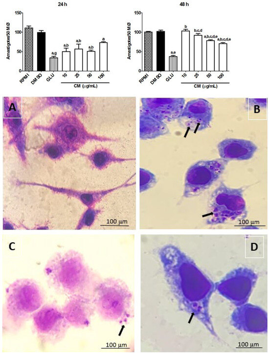 Effect evaluation against the amastigote forms: macrophages of the RAW 264.7 lineage (1 × 106 cells/mL) were cultured with L. braziliensis (107 promastigotes/mL), in a ratio of 10 parasites to 1 macrophage. After 12 h, they were incubated (37 °C; 5% CO2) with CM (10, 25, 50, and 100 µg/mL) for 24 and 48 h. As a control, supplemented RPMI medium, DMSO 0.1%, and GLU (4 mg/mL) were used. Evaluation was carried out under an optical microscope (100×), and fifty macrophages were examined. Experiments were performed in triplicate, and the results are expressed in amastigotes/50 macrophages. GLU: glucantime®, and CM: coumarin. Each column represents the mean ± S.E.M. p < 0.05 to RPMI (a); to 0.1% DMSO (b); to GLU (c); to CM 10 µg/mL; (d); and CM to 25 µg/mL (e) and to 100 (g) (one-way ANOVA; Tukey test). Photomicrograph of RAW 264.7 lineage macrophages infected with L. braziliensis and treated with CM. (A): uninfected macrophages; (B): macrophages infected + 0.1% DMSO (vehicle); (C): macrophages infected and treated with GLU (4 mg/mL; positive control); and (D): macrophages infected and treated with CM (100 µg/mL). Cells were stained with Giemsa, and the evaluation was carried out under an optical microscope (100×). The arrows indicate the presence of L. braziliensis in the amastigote form.
