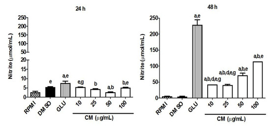 Nitrites levels produced by RAW 264.7 lineage macrophages infected with L. braziliensis. Macrophages of the RAW 264.7 lineage (1 × 106 cells/mL) were cultured with L. braziliensis (107 promastigotes/mL), in a ratio of 10 parasites to 1 macrophage. After 12 h, they were incubated (37 °C; 5% CO2) with CM (10, 25, 50, and 100 µg/mL). After 24 and 48 h, the supernatants were collected for nitric oxide dosages. As a control group, supplemented RPMI medium, DMSO 0.1%, and GLU (4 mg/mL) were used. The absorbance was measured at 560 nm, the nitrite content was determined from a sodium nitrite standard curve, and the results are expressed as μmol nitrite/mL. GLU: glucantime®, and CM: coumarin. Each column represents the mean ± S.E.M. p < 0.05 to RPMI (a); to 0.1% DMSO (b); to 10 (d); to 25 (e); and to 100 (g) (one-way ANOVA; Tukey test).