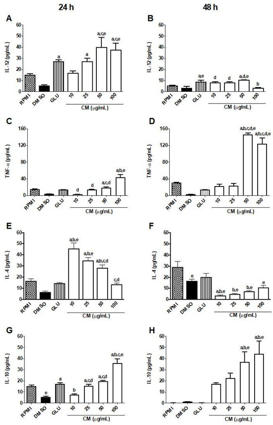 According to the cytokines evaluated, the treatment of infected cells with CM lead to an increase in the production of cytokines (after 24 and/or 48 h of incubation), one of the main targets in leishmanicidal action. Upon the infection of macrophages by L. braziliensis, both CM and GLU increased the production of IL-12 in infected macrophages when related to the 0.1% DMSO group (vehicle/control group). The highest concentrations of CM after 24 h of incubation (50: 40.16 ± 8.801 pg/mL; 100: 37.81 ± 6.00 pg/mL) showed better results than GLU (4 mg/mL: 27.36 ± 1.266 pg/mL) when compared to the 0.1% DMSO group (5.474 ± 0.757 pg/mL). After 48 h of incubation of CM or GLU in infected macrophages, only GLU and CM (50 µg/mL) augmented the concentration of IL-12 (9.04 ± 1.24 and 10.51 + 0.11 pg/mL, respectively), in relation to the DMSO group (3.33 ± 1.55 pg/mL). There was no statistical difference between the GLU and CM groups (Figure 5A,B).
