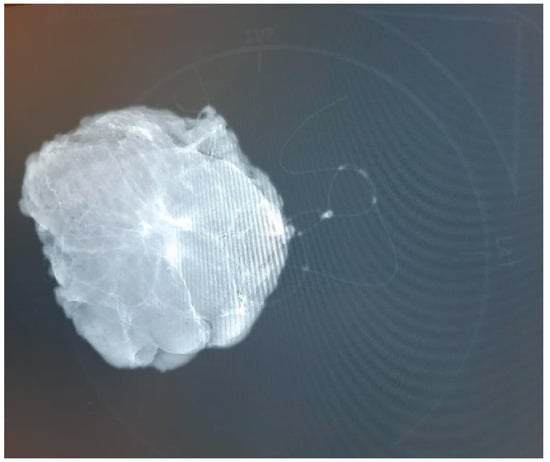 A mammographic image of the oriented breast tissue specimen with radio-guided tumor localization on the specimen plate. The specimen plate provides high-fidelity localization, accurately reflecting the specimen’s position within the breast. Traditional suture marking (single, long = lateral; double, short = superior) is also applied, using a thick yarn that creates an X-ray shadow.