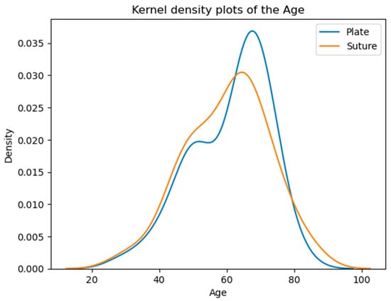 Age distribution of the patients. According to the Kolmogorov–Smirnov test, no significant difference is detected (p = 0.5373) between the two distributions. The vertical axis shows the estimated probability density of the age variable based on kernel density estimation.