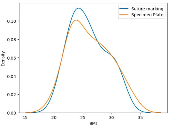 Distribution of body mass index (BMI) values in the Specimen Plate and Suture Marking groups. No significant difference was observed between the groups, supporting baseline comparability in terms of body habitus.