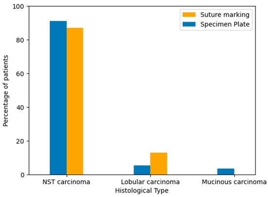 To evaluate the distribution of tumor histology between the two groups, breast cancer types were classified based on standard pathological diagnosis after core biopsy. The majority of cases in both groups were invasive carcinoma of no special type (NST). Lobular and mucinous carcinomas occurred in a minority of patients. The histological type distribution was similar between the Specimen Plate and Suture Marking groups, supporting cohort comparability (Table 3, Figure 5).