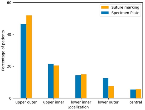 Distribution of tumor localization within the breast by quadrant in the Specimen Plate and Suture Marking groups. The upper outer quadrant was the most frequent tumor location in both cohorts, with similar distributions observed across all regions (p = 0.6577).
