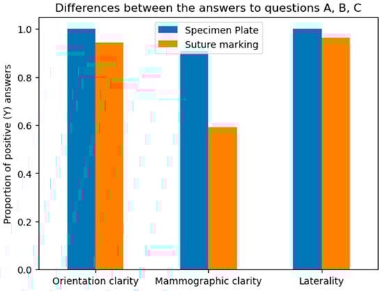 Differences in responses to questions A (Orientation clarity), B (Mammographic clarity) and C (Clarity of specimen laterality), comparing the specimen plate technique to traditional suture marking. Mammographic clarity showed strong significance in favor of the Specimen Plate Group. The vertical axis indicates the proportion of positive responses for each question in both groups.