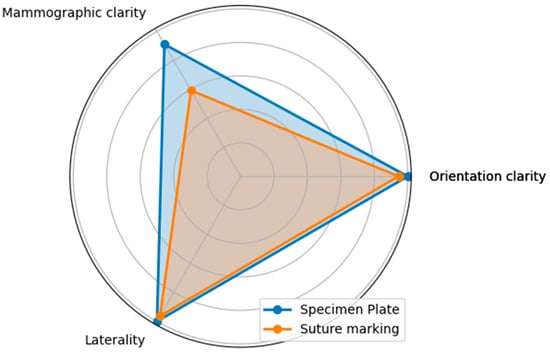 The radar diagram compares the performance of the Specimen Plate and traditional Suture Marking techniques across key parameters related to breast specimen orientation (Questions A—Orientation clarity, B—Mammographic clarity, and C—Clarity of specimen laterality). The shaded areas highlight the differences in performance between the two methods.