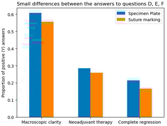 Differences between the Specimen Plate and traditional Suture Marking methods in responses to Questions D, E, and F. (Question D—macroscopic clarity of tumor localization, E—neoadjuvant therapy usage, and F—complete radiologic or pathologic regression). While small variations exist, none of the differences for these parameters were statistically significant, indicating comparable numbers of the two methods for the evaluated factors. The vertical axis indicates the proportion of positive (“Yes”) responses for each question in both groups.