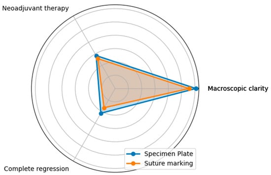 The radar diagram visualizes the performance of the Specimen Plate and traditional Suture Marking techniques for Questions D, E, and F, highlighting their similarities. The overlapping areas in the radar plot emphasize the minimal differences between the two groups for these parameters, reinforcing their comparable results in these aspects.