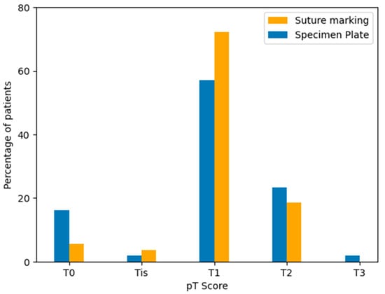 Distribution of pathological tumor stages (pT) in the Specimen Plate and Suture Marking groups. Most tumors were classified as pT1 in both cohorts. A higher proportion of pT0 tumors was observed in the Specimen Plate group, corresponding to neoadjuvant therapy-associated regression.