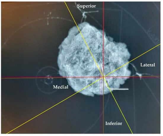 In our study, tumor localization was recorded based on both the mammographic image and the photograph of the surgical specimen fixed on the specimen plate. The plate provided a fixed and reproducible reference frame, allowing consistent visual correlation between the specimen and the preoperative mammography. Although a formal grid system was not used, the combination of the specimen plate’s orientation and the imaging allowed precise documentation and evaluation of tumor location in all cases.