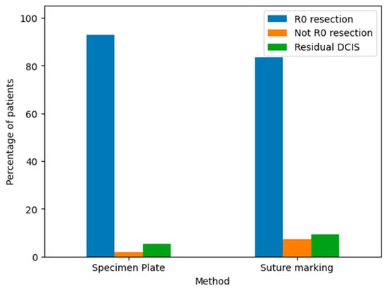 Immunohistochemical classification included the following subtypes: hormone receptor-positive/HER2-negative (HR+/HER2−), triple-negative breast cancer (TNBC), triple-positive breast cancer (TPBC), and hormone receptor-negative/HER2-positive breast cancer (HR−/HER2+). The majority of tumors in both groups were HR+/HER2−. To verify the similarity in distribution, we performed comparative statistical analysis using both a Fisher’s exact test and a Chi-squared test. The p-value was 0.2208, indicating no statistically significant difference in subtype distribution between the Specimen Plate and Suture Marking groups (Table 4, Figure 6). These results confirm that the biological characteristics of the tumors were well balanced across both study arms.
