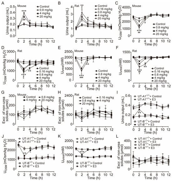 Diuretic effects of single intragastric administration of E3 in mice and rats. (A) Urine output of mice. (B) Urine output of rats. (C) Urinary osmolality of mice. (D) Urinary osmolality of rats. (E) Urinary urea concentration of mice. (F) Urinary urea concentration of rats. (G) Excretion of non-urea solutes of mice. (H) Excretion of non-urea solutes of rats. (I) Urine output of UT-A1−/− and UT-B−/− mice. (J) Urinary osmolality of UT-A1−/− and UT-B−/− mice. (K) Urinary urea concentration of UT-A1−/− and UT-B−/− mice. (L) Excretion of non-urea solutes of UT-A1−/− and UT-B−/− mice. Data are presented as mean ± SEM (n = 6). * p < 0.05, ** p < 0.01 and *** p < 0.001, E3 20 mg/kg vs. Ctr. # p < 0.05, ## p < 0.01 and ### p < 0.001, E3 4 mg/kg vs. Ctr. $ p < 0.05, E3 0.8 mg/kg vs. Ctr.