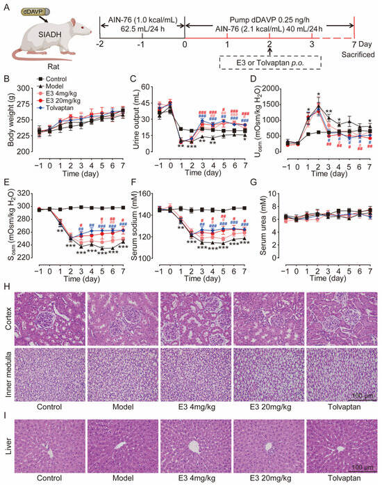 The therapeutic effect of E3 on hyponatremia was subsequently evaluated in a rat model with the SIADH, as illustrated in Figure 4A. Throughout the experiment, all rats showed moderate weight gain (Figure 4B). Following the infusion of dDAVP via a pump, the urine output in the model rats was significantly reduced (Figure 4C), while urine osmolality was increased in comparison to the control rats (Figure 4D). Concurrently, serum osmolality and sodium levels decreased in the model rats (Figure 4E,F), confirming the successful establishment of the SIADH hyponatremia model. After the treatment of E3 or tolvaptan (the positive control), the hyponatremia in SIADH rats was significantly alleviated, with significantly increased serum osmolality and sodium concentration compared to the model rats. There was no significant difference in blood urea levels between the experimental groups before and after treatment (Figure 4G). In addition, H&E staining also showed normal tissue structures in the kidney, except for dilatation of collecting ducts, and liver of E3 or tolvaptan-treated rats (Figure 4H,I). These results indicate that E3 alleviates hyponatremia through its diuretic mechanism.