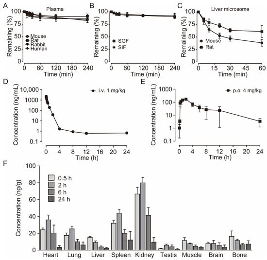 The pharmacokinetic profiles of E3. (A) Stability of E3 in the plasma of various species. (B) Stability of E3 in simulated gastric fluid (SGF) and simulated intestinal fluid (SIF). (C) Stability of E3 in mouse and rat liver microsomes. Data are presented as mean ± SD (n = 3). (D) Mean plasma concentration of E3 in SD rats after a single i.v. dose at 1 mg/kg body weight. (E) Single p.o. dose at 4 mg/kg body weight. (F) Tissue distribution of E3 in SD rats after a single oral dose at 4 mg/kg. Data are presented as mean ± SEM (n = 5).