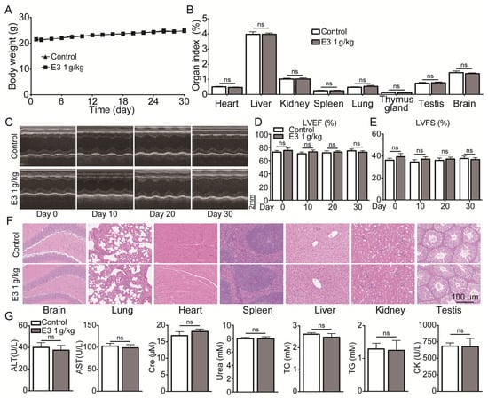 During 30 days of continuous 1000 mg/kg E3 daily administration, there was no apparent abnormality in the appearance, behavior, secretions, and excretions of all treated mice. There was no significant change in body weight or organ indexes (Figure 6A,B). In addition, the results of cardiac ultrasound showed no significant abnormality in the left ventricular ejection fractions (LVEF) and left ventricular fractional shortening (LVSF) indicators of mice during and after the administration of E3 (Figure 6C–E). No histopathological toxic lesion related to the treatment with E3 was found in the brain, lung, heart, spleen, liver, kidney, or testis (Figure 6F). The analysis of blood samples showed that there were no significant changes in blood parameters and blood biochemical indexes between the E3-treated and control groups (Figure 6G) (Table S4). Observing mice during the recovery period, it was found that compared with the control group, all mice in the E3 group survived without any abnormal changes in body weight and organ indexes, indicating that E3 had no delayed toxicity (Figure S4).