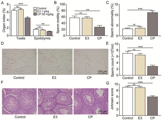 Male mice were randomly divided into three groups: control group (0.5% CMC-Na), E3 2000 mg/kg group, and positive group (50 mg/kg cyclophosphamide (CP), administered via intraperitoneal injection). E3 and the control group were administered once daily by intragastric gavage. All mice received treatment for 5 consecutive days. After the initial dosing period, which lasted 35 d, the mice were euthanized, and evaluation of sperm parameters was performed as follows: