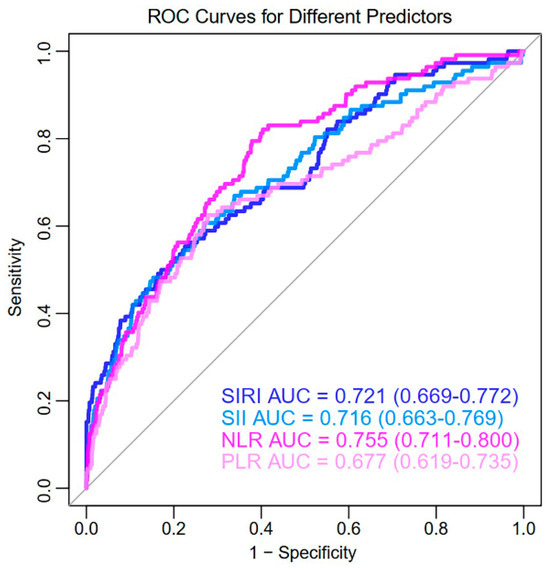 The CBC-derived inflammatory biomarkers were as follows: SIRI = (neutrophils × monocytes)/lymphocytes; systemic immune inflammation index (SII) = (neutrophils × platelets)/lymphocytes; neutrophil–lymphocyte ratio (NLR) = neutrophils/lymphocytes; and platelet–lymphocyte ratio (PLR) = platelets/lymphocytes.