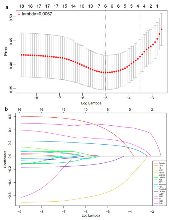 Results of LASSO-Logistic regression: (a) the cross-validation plot of LASSO-logistic regression; (b) selection process of Lasso regression model by cross-validation method. CAD, coronary artery disease; Hb, hemoglobin; WBC, white blood cell; NEUT, neutrophil count; MONO, monocyte count, LYMPH, lymphocyte count; ALT: alanine aminotransferase; AST, aspartate aminotransferase; HDL, high-density lipoprotein; Pro-BNP, pro-brain natriuretic peptide; CK-MB, creatine kinase isoenzymes MB; LVEF, left ventricle ejection fraction; SIRI, systemic inflammation response index; SII, systemic immune inflammation index; NLR, neutrophil-to-lymphocyte ratio; PLR, platelet-to-lymphocyte ratio.