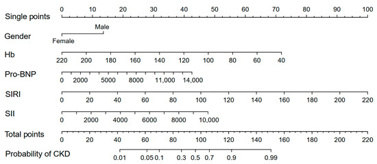 Nomogram to predict the possibility of CKD in HCM patients. HCM, hypertrophic cardiomyopathy; CKD, chronic kidney disease; Hb, hemoglobin; Pro-BNP, pro-brain natriuretic peptide; SIRI, systemic inflammation response index; SII, systemic immune inflammation index.