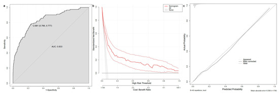 Receiver operating characteristic curve (a), decision curve (b), and calibration curve (c) of the nomogram. AUC, area under curve.