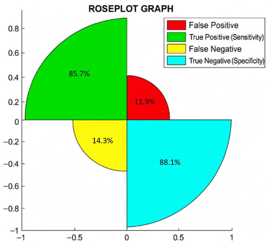 Additionally, in Figure 1, we show the rose plot, where the percentages of true negative or specificity, true positive or sensitivity, false negative, and false positive are reported.