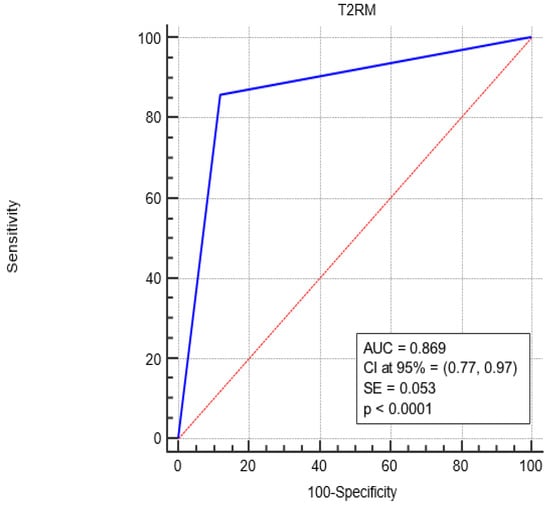 The AUC associated with T2RM diagnostic performance was significantly greater than 0.5 (0.869 vs. 0.5, p < 0.0001), i.e., T2RM is a more accurate diagnostic since the AUC is greater than 0.5.