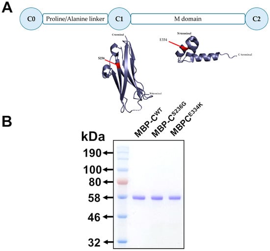 To explore the potential structural and functional effects of the p.S236G and p.E334K amino acid substitutions within cMyBP-C at the protein level, cMyBP-CWT, cMyBP-CS236G, and cMyBP-CE334K isolated C0–C2 domains (Figure 3A) were cloned into the pETMM11 plasmid vector, expressed as recombinant proteins utilizing a prokaryotic expression system and purified by affinity chromatography, as described in the Materials and Methods section. SDS-PAGE analysis of the resultant recombinant proteins revealed a single band with mobility consistent with the predicted molecular weight (~54 kDa) for all expressed proteins, confirming their homogeneity (Figure 3B).