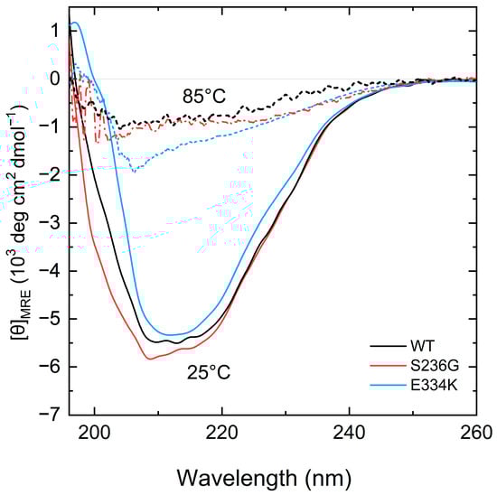 To elucidate any potential structural impact of the p.S236G and p.E334K substitutions, circular dichroism was employed to analyze the far-UV CD spectra (Figure 4) and determine the secondary structural content of all recombinant protein fragments at 25 °C (Table 2).