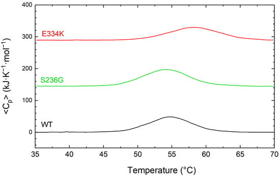 For a more comprehensive examination of the thermal unfolding behavior of these domains, the cMyBP-CWT (black), cMyBP-CS236G (red), and cMyBP-CE334K protein samples were further analyzed using differential scanning calorimetry (DSC), and the results are shown in Figure 5 and summarized in Table 3. Our data indicates a two-step unfolding mechanism for the protein fragments, characterized by an enthalpy change in the region of 375 to 432 kJ/mol and a Tm ranging from 58.4 °C to 54.2 °C (Table 3). Compared to cMyBP-CWT, cMyBP-CS236G and cMyBP-CE334K C0–C2 protein fragments showed a ~6 and ~13% reduced enthalpy, respectively, consistent with small structural modifications within the molecular arrangement. This is in excellent agreement with our CD measurements for these two variants. It is also worth noting that the thermal unfolding profile of cMyBP-CE334K exhibited an increased thermal stability for this mutant in comparison to cMyBP-CWT (Tm = 58.4 vs. 54.7 °C, respectively), (Figure 5 and Table 3).