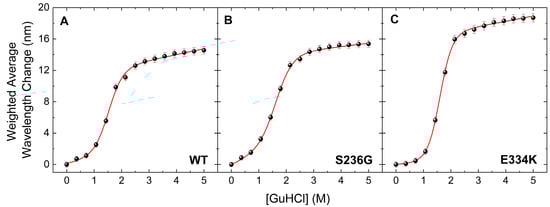 The thermal transition reversibility for all cMyBP-CWT, cMyBP-CS236G, and cMyBP-CE334K proteins was found to be less than 60%, as determined by comparing the ΔHunf values from the first and second DSC run of the same sample. This suggests that deriving meaningful thermodynamic stability data from the obtained thermograms is not feasible, as there is a significant kinetic component involved. To further investigate the thermodynamic stability of these two cMyBP-C variants (cMyBP-CS236G and cMyBP-CE334K), we performed chemical denaturation experiments by measuring fluorescence emissions of the proteins under different concentrations of the chemical denaturant GuHCl in the solution. Results indicated a notable decrease in the free energy change (ΔGDN) for cMyBP-CS236G, whereas intriguingly, cMyBP-CE334K exhibited an increased ΔGDN compared to cMyBP-CWT (Figure 6 and Table 4). Considering that ΔGDN represents the energy barrier separating the fully folded and fully unfolded states of the protein, this can be directly interpreted as an increase in the thermodynamic stability of cMyBP-CE334K. Interestingly, the thermal unfolding of cMyBP-CE334K monitored by DSC also showed increased thermal stability for this mutant compared to cMyBP-CWT (Tm = 58 °C vs. 54 °C, respectively). Thermal and chemical unfolding processes might follow a different pathway on the energy landscape of the protein, but in both cases, p.E334K seems to increase the stability of the protein fragment. Our findings suggest that the p.E334K substitution may result in a more rigid structure compared to the wild-type isoform, potentially affecting the dynamics and flexibility of the molecule, which in turn may impair interaction with other important protein binding targets.